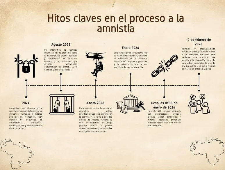 En medio de un clima político tenso y esperanzas opositoras, Venezuela vive uno de los pocos momentos de apertura política en más de una década de represión y detenciones arbitrarias: la promesa de liberar a presos políticos mediante una Ley de Amnistía General que ha reactivado las demandas por justicia, reparación y memoria.